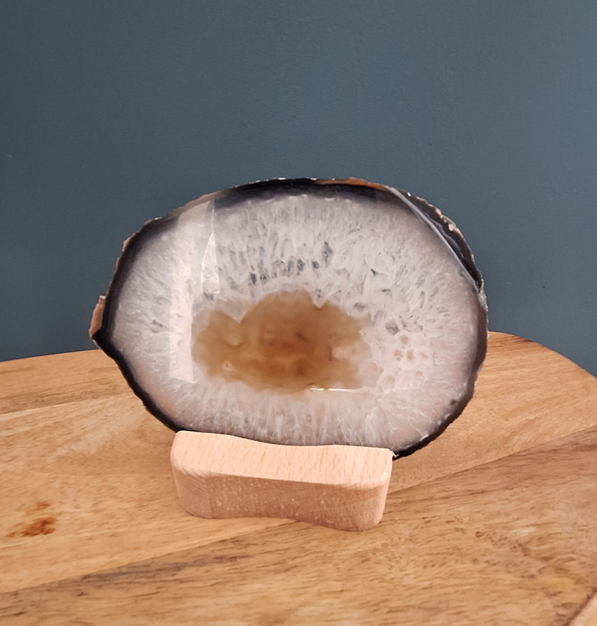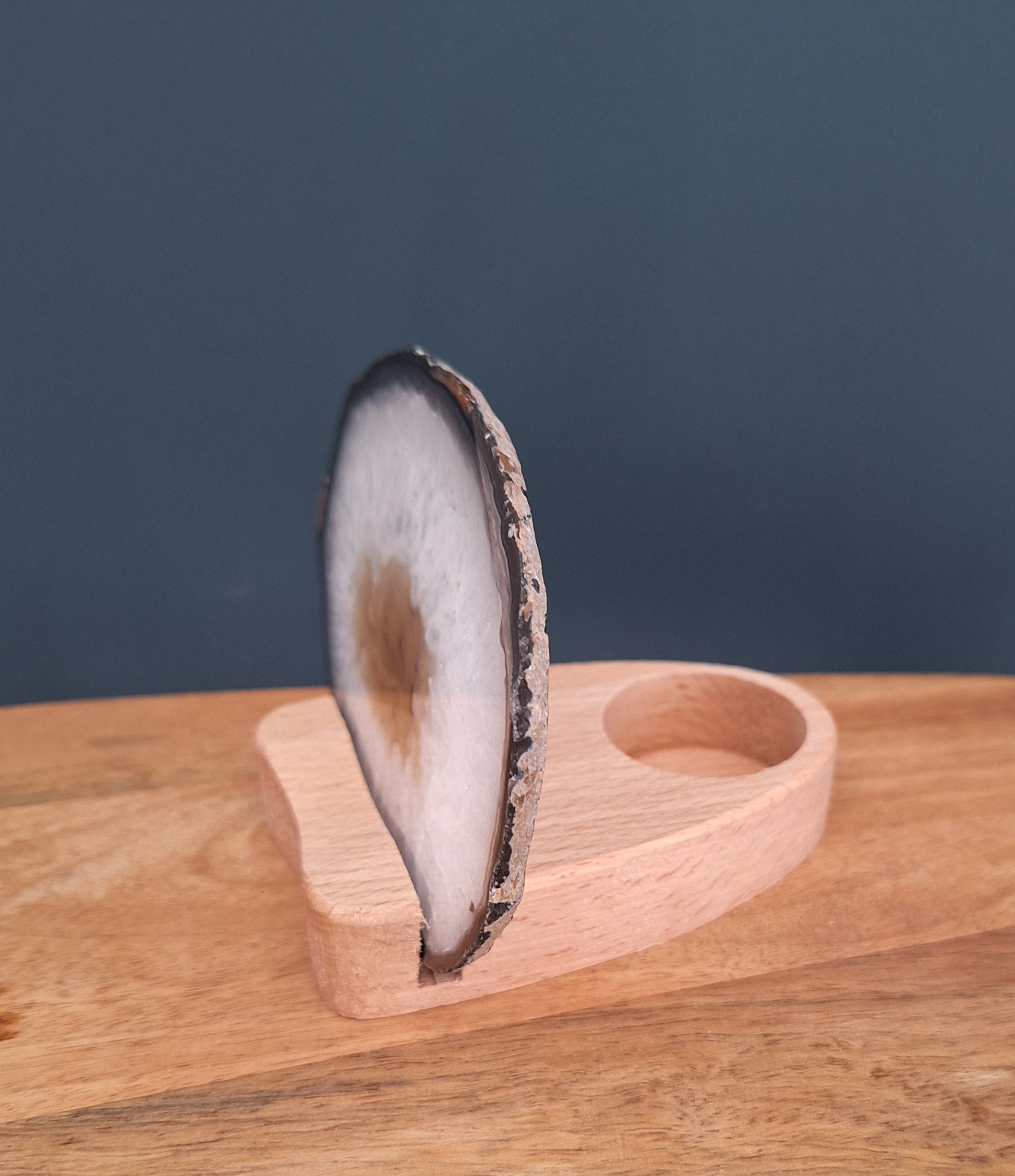 Deze waxinelichthouder wil je in huis hebben. Hij geeft echt prachtig warm en zacht licht. De houder is gemaakt van hout en heeft een uitsparing voor het waxinelichtje en de agaatschijf. Agaat is een aardende, stabiliserende en beschermende steen. De steen bevordert innerlijke rust en kalmte. Precies wat we nodig zijn in deze drukke tijden.