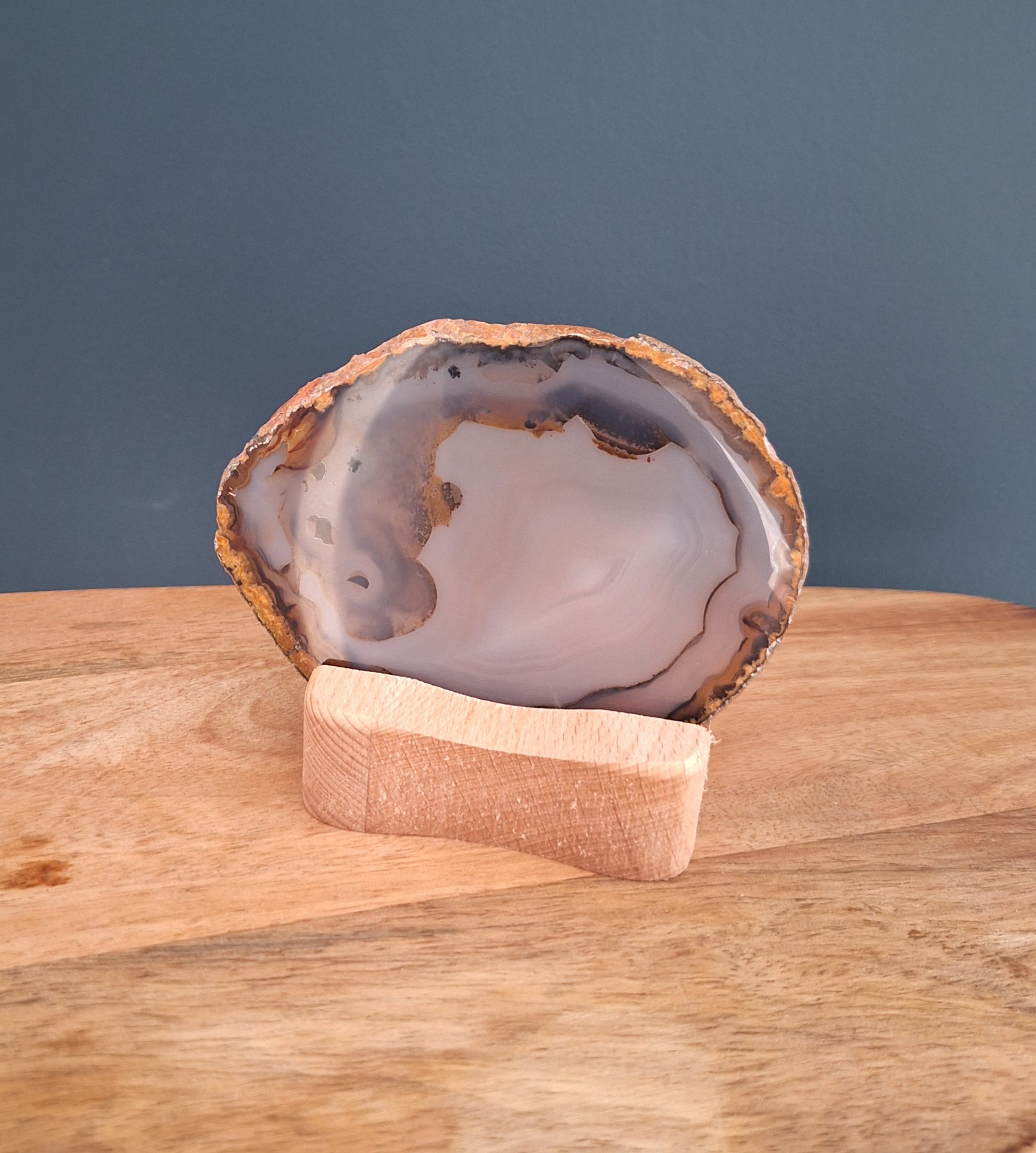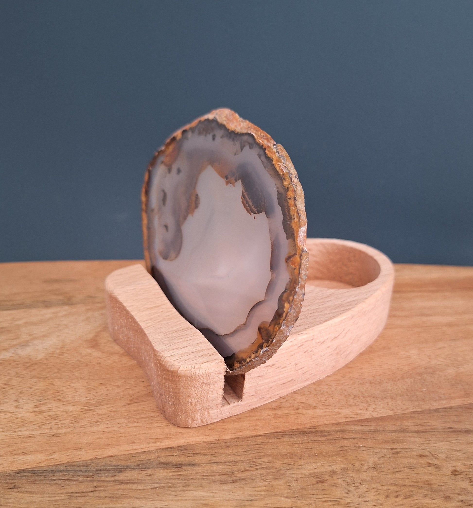 Deze waxinelichthouder wil je in huis hebben. Hij geeft echt prachtig warm en zacht licht. De houder is gemaakt van hout en heeft een uitsparing voor het waxinelichtje en de agaatschijf. Agaat is een aardende, stabiliserende en beschermende steen. De steen bevordert innerlijke rust en kalmte. Precies wat we nodig zijn in deze drukke tijden.