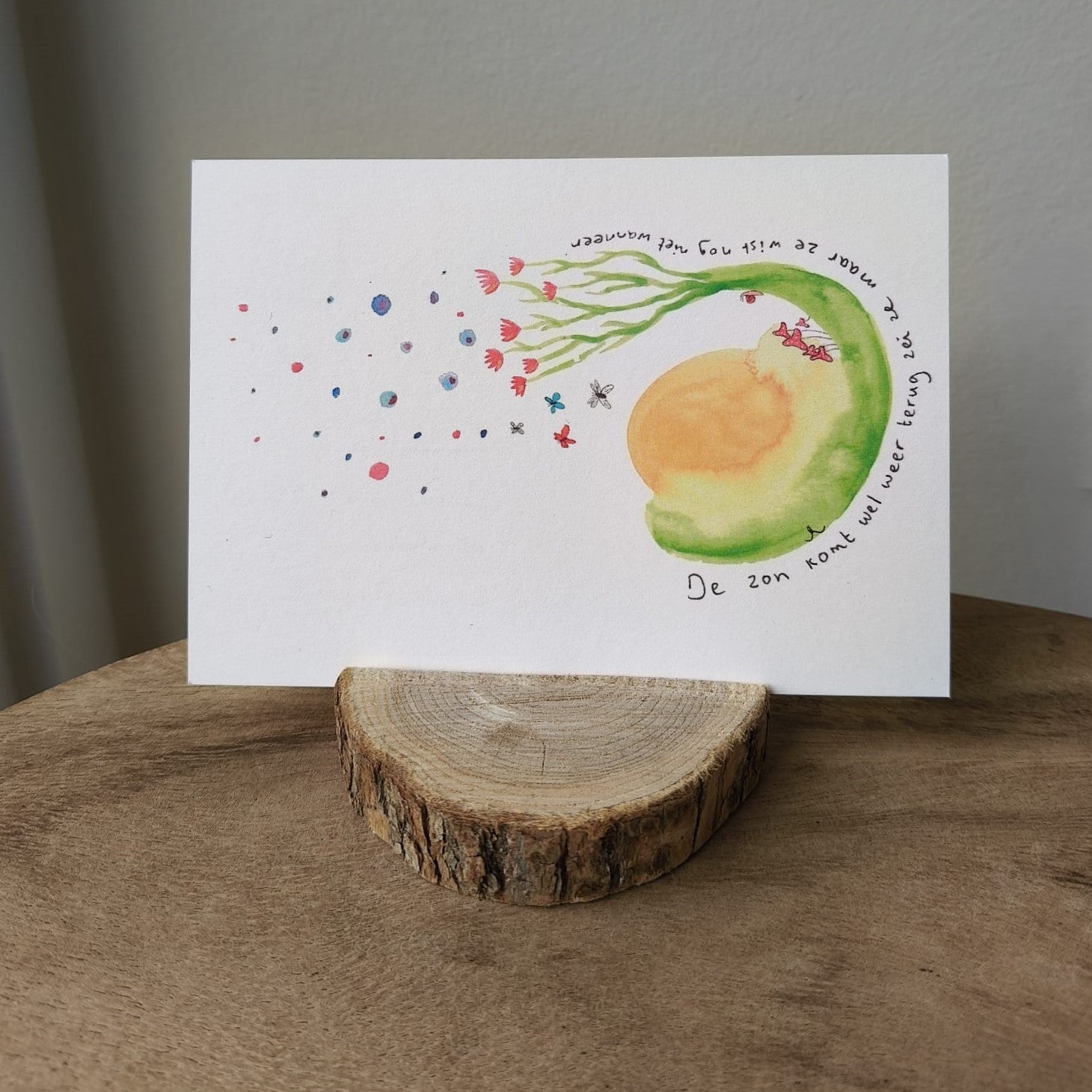 Een prachtige kaart van Ingeworteld met de tekst ''De zon komt wel weer terug zei ze, maar ze wist nog niet wanneer''