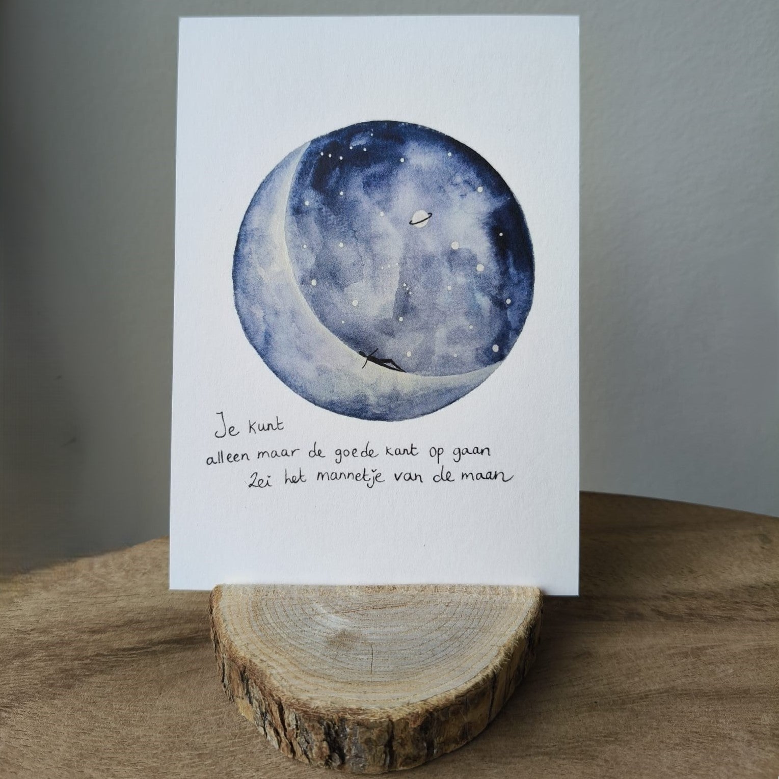 Een prachtige kaart van Ingeworteld met de tekst ''Je kunt alleen maar de goede kant op gaan, zei het mannetje van de maan''