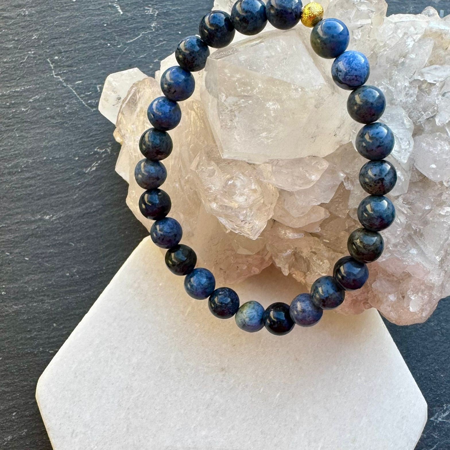 Deze armband is gemaakt van Sodaliet edelsteen kralen.