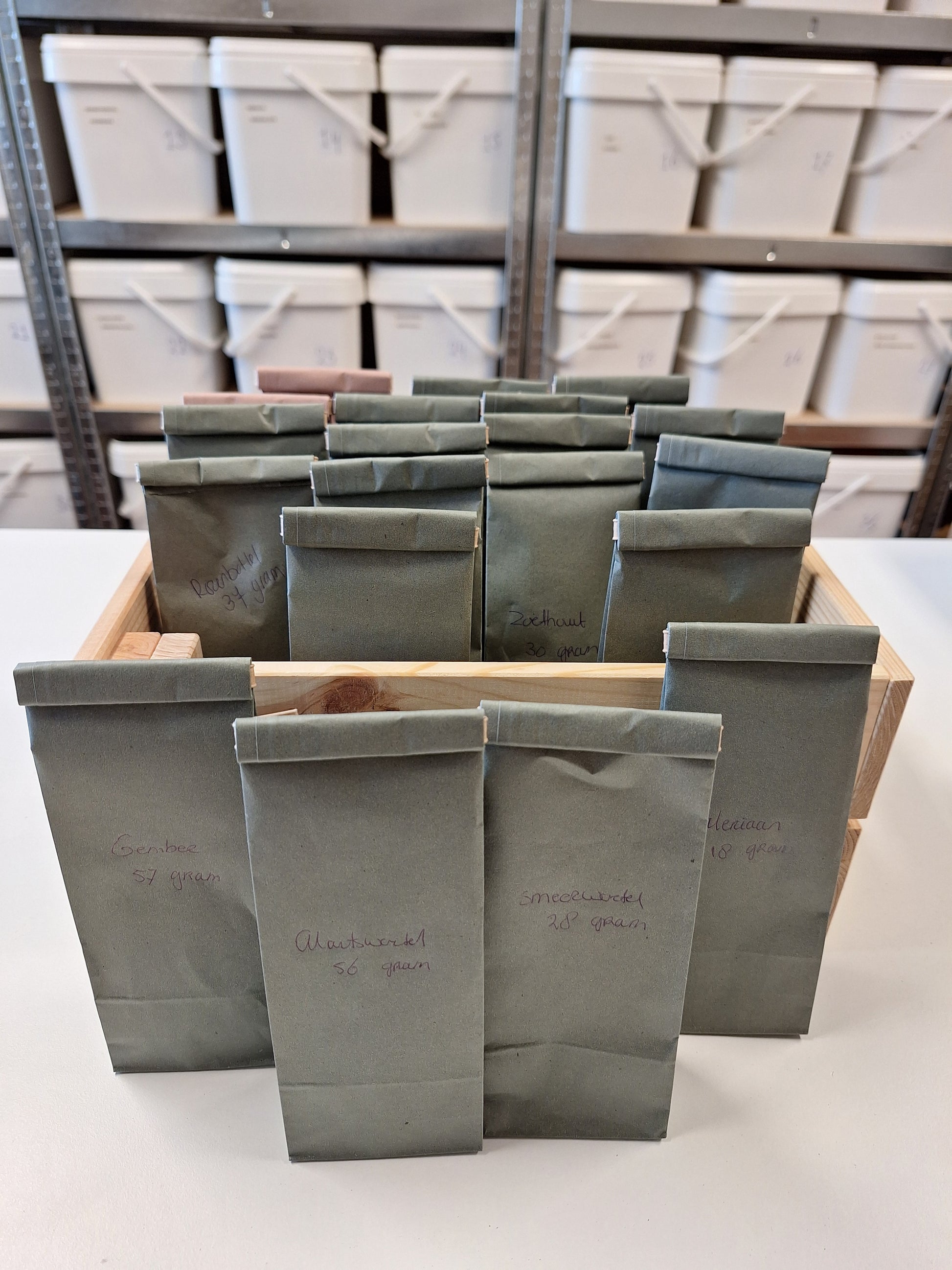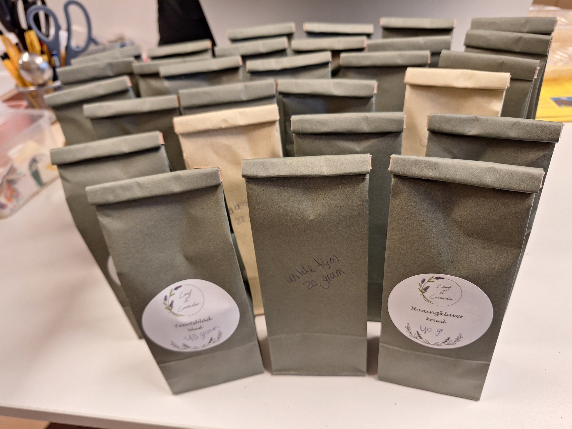 Tijdens het vullen van de kruiden zakjes houden wij altijd wat restjes over. Zonde om weg te gooien! Daarom verkopen we af en toe een restjes pakket. Noem het de kneusjes onder de kruiden, sommige zakjes hebben een label, andere niet. Wel staat er overal een datum op. En staat er op geschreven welk kruid er in zit en hoeveel gram.
