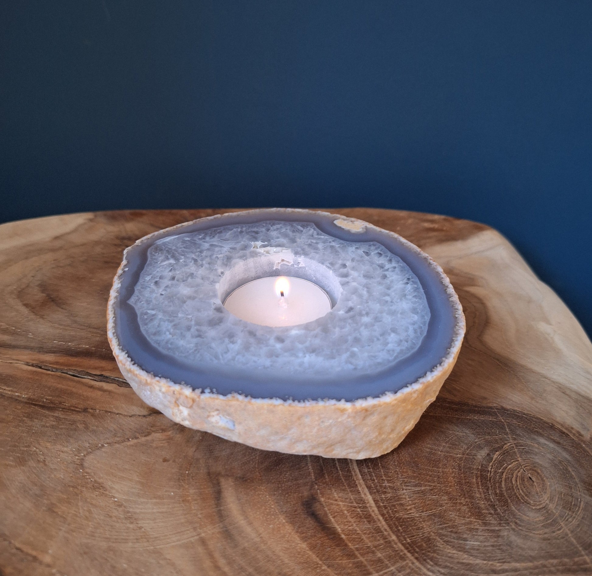 Plaats een eenvoudig waxinelichtje in de houder en steek het aan. Het zachte kaarslicht reflecteert prachtig door de edelsteen en creëert een serene ambiance. De houder is geschikt voor standaard waxinelichtjes, die gemakkelijk te vervangen zijn wanneer ze opgebrand zijn.