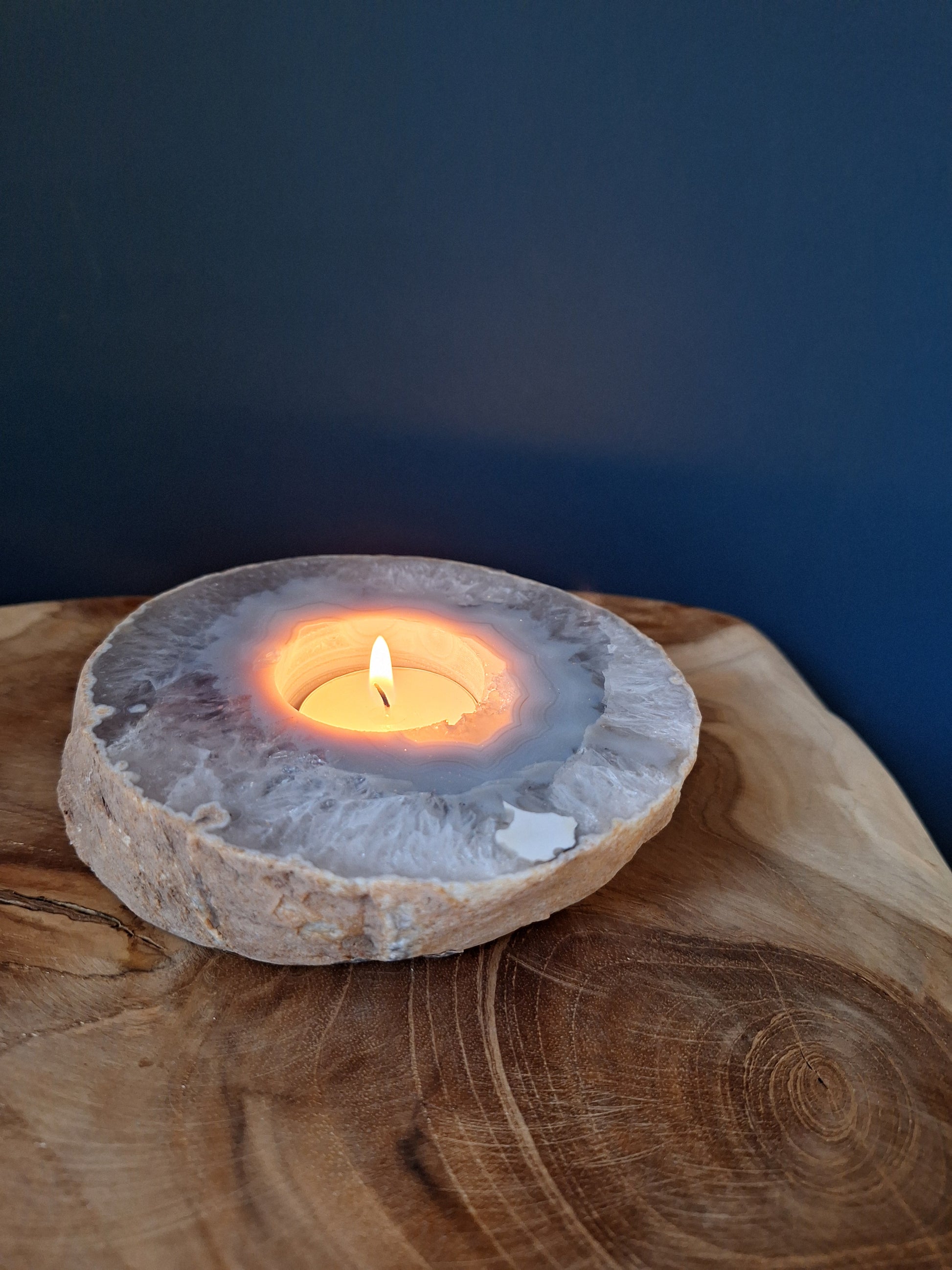 Let op: dit is een natuurproduct. Het kan voorkomen dat er oneffenheden in de steen en of waxinelicht gaten zitten. Sommige stenen zijn kwetsbaarder; polijstfouten of lichte splinters zijn mogelijk.