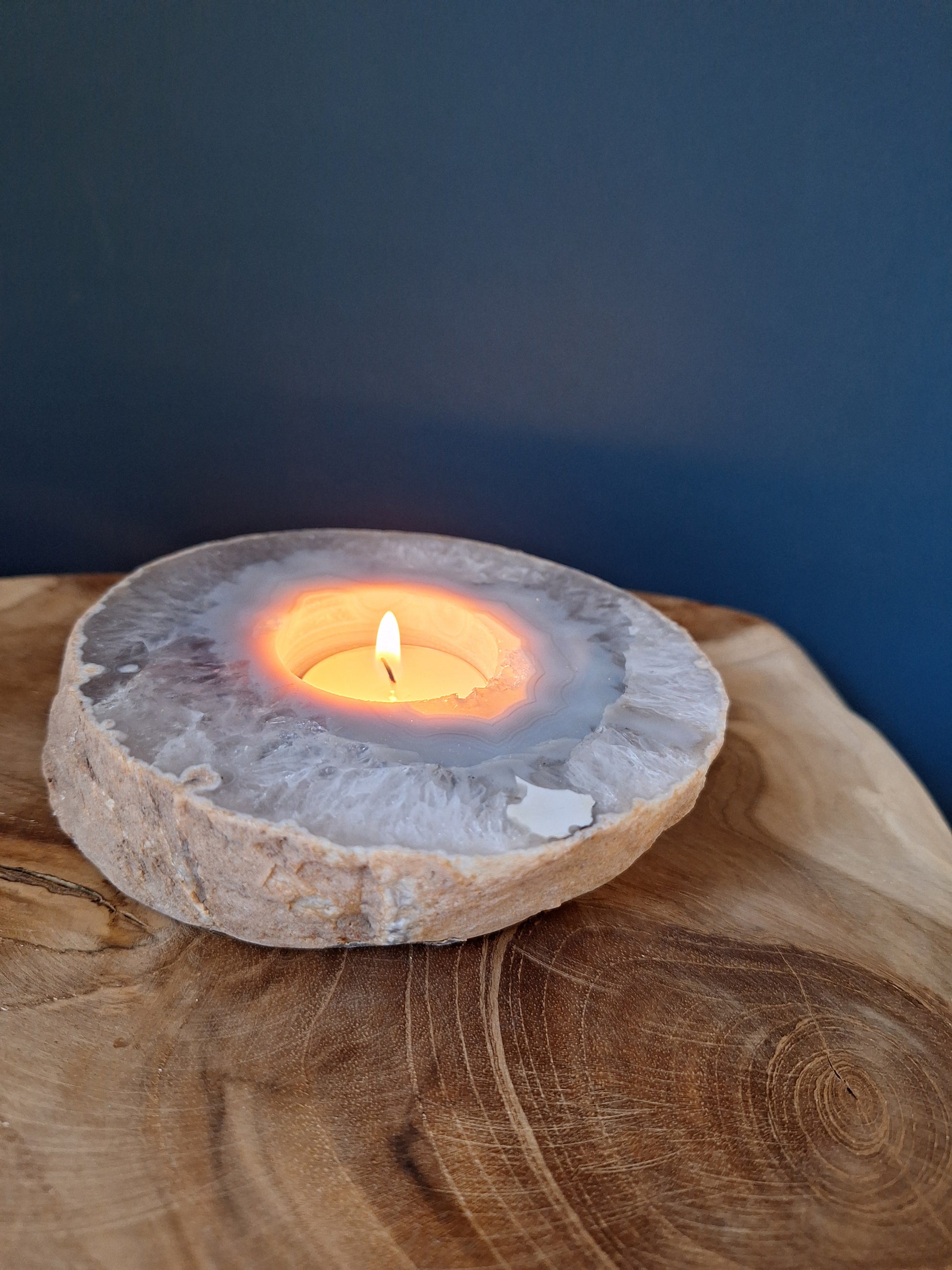 Ben je op zoek naar een stijlvolle en rustgevende toevoeging voor je interieur? De waxinelichthouder van Agaat met 1 waxinelichtje is niet alleen een prachtige decoratie, maar biedt ook spirituele voordelen. Deze unieke houder, gemaakt van de edelsteen Agaat, zorgt voor een sfeervol en warm licht dat elke ruimte in een oase van rust verandert.